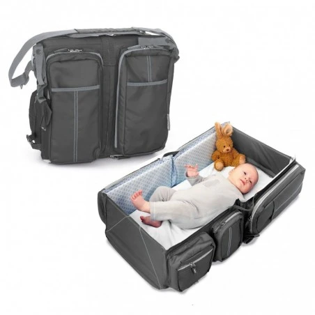 Baby Travel è la borsa da viaggio ideale per il vostro bambino in quanto in questa pratica borsa potrete portare con voi tutto il necessario per il bambino e, senza doverla svuotare si trasforma rapidamente in una comoda culla dove il bambino puo’ riposare tranquillamente o addirittura essere cambiato diventando anche un fasciatoio da viaggio.
